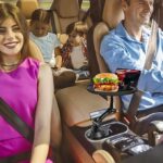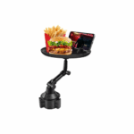 Our cup holder table features a 360° swivel design and articulating arms that allow you to adjust the table to the perfect position, or swivel it back and forth between you and a passenger.