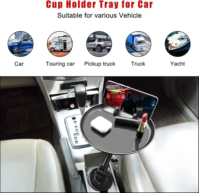 Tray TableThis car cup holder has a 360° rotatable tray with a non-slip silicone pad and mobile phone holder, which can be used as a storage box for dinner plates or small accessories.