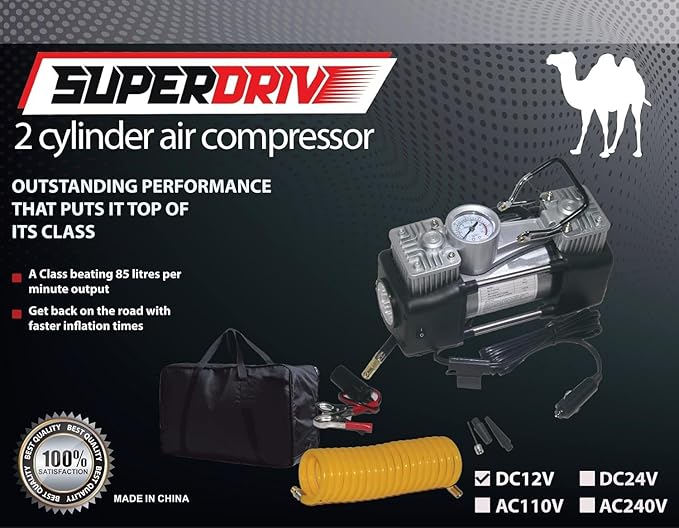 - Powerful Performance: Experience efficient air compression with the Camel 2 Cylinder Air Compressor, boasting a maximum air flow of 85 Liters per minute for rapid inflation tasks.