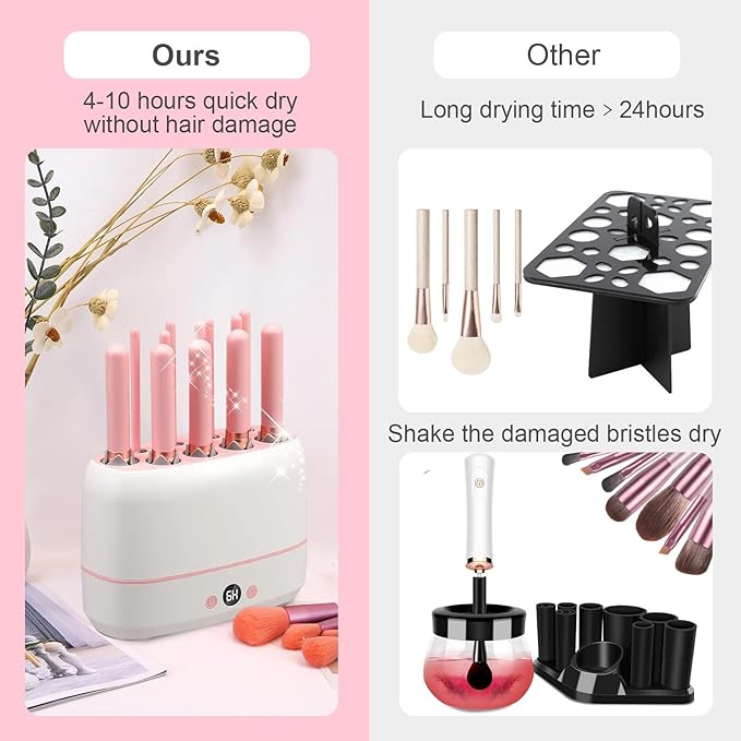- Featuring a constant temperature drying system, this dryer utilizes a 65°C bottom heat for sponges and brushes, and a 360° airflow of less than 45-50°C internally for gentle brush drying. This prevents damage to delicate bristles while ensuring thorough drying, promoting hygiene and extending the lifespan of your tools.